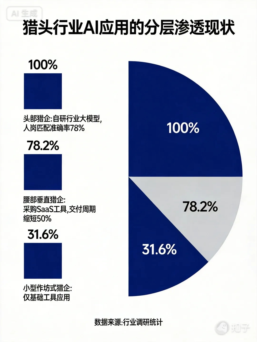腰部垂直猎企:AI应用渗透率达78.2%,通过采购SaaS化AI工具,聚焦垂直赛道做深度业务融合。事务性工作时间减少40%,交付周期缩短50%。