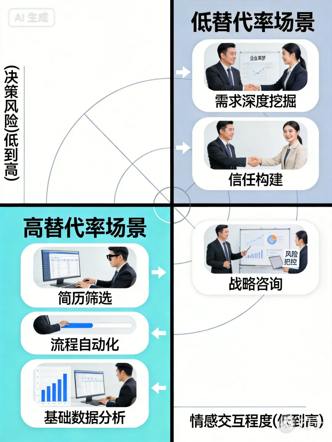 - 候选人深度信任构建与职业规划:AI替代率18.4%