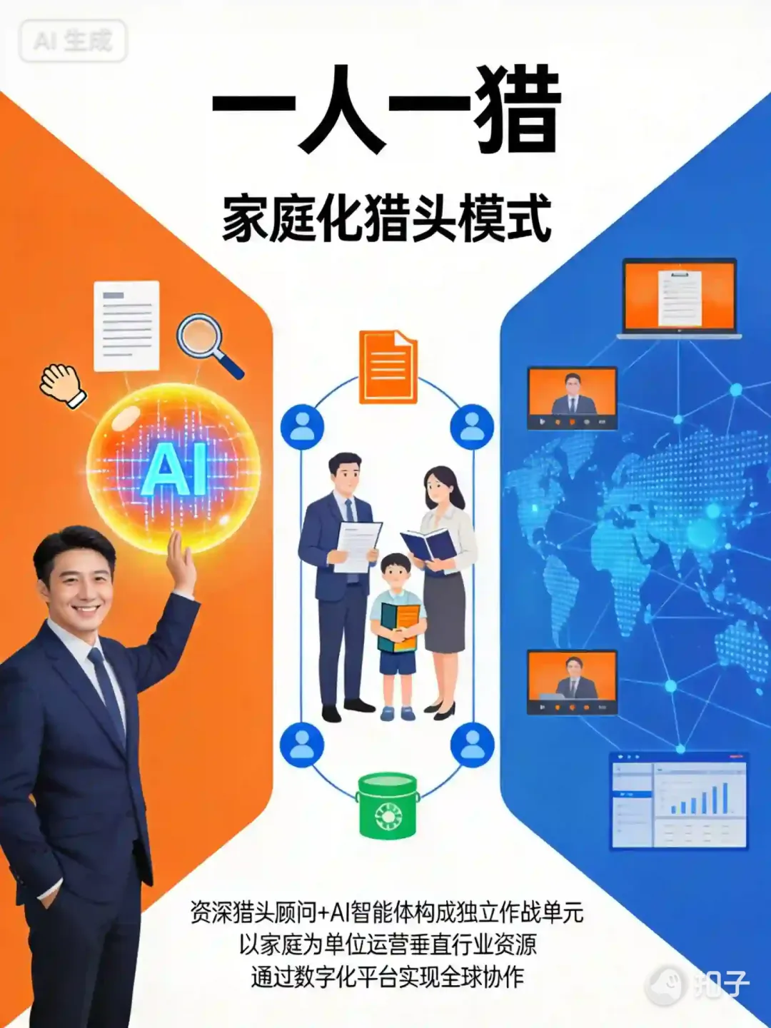 铭派国际猎头创始人刘晓春提出的"一人一猎家庭化猎头""一人公司"计划,将成为行业主流范式。每个资深猎头顾问+专属AI智能体构成独立作战单元,以家庭为单位运营垂直行业资源,通过数字化平台实现全球协作。