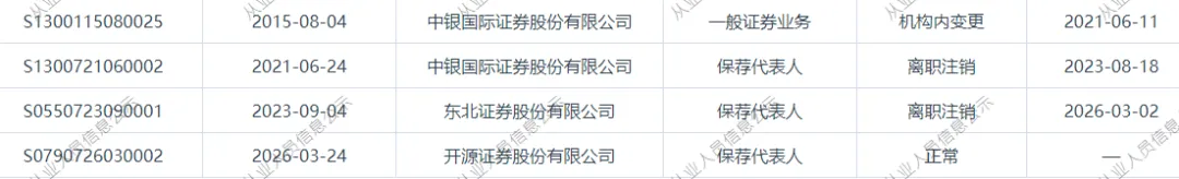 近日,证券从业系统显示,韩刘峰,3月2日从东北证券离任,3月24日加入开源证券。韩刘峰,东北证券保荐代表人。