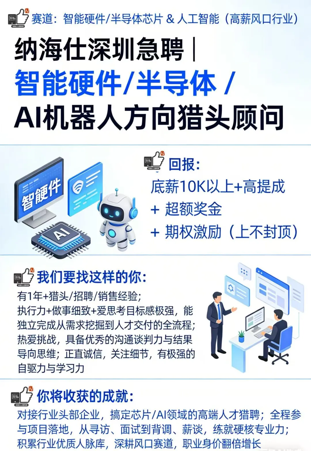 有 1 年 + 猎头 / 招聘 / 销售经验;能独立完成从需求挖掘到人才交付的全流程;