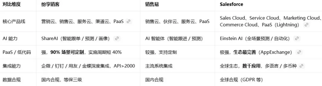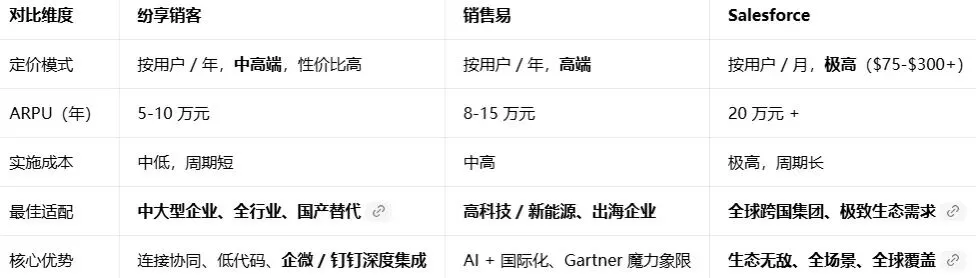 核心优势:AI+CRM 深度融合(ShareAI)、全链路连接能力、PaaS 强定制、行业化深耕、生态完善;续费率高、客单价 50 万 +。