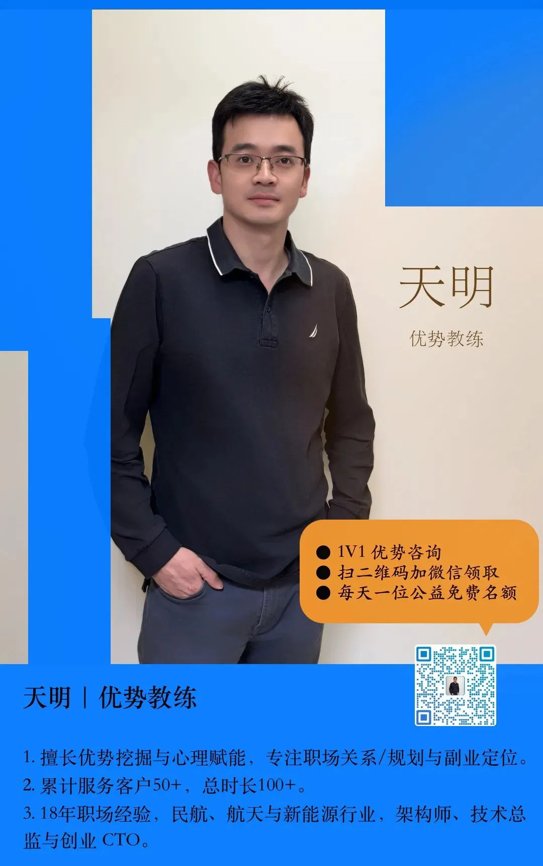 我核心在做一件事:帮职场人(尤其技术/转型中的朋友)看清自身优势,破解发展卡点,找到可持续的成长路径。