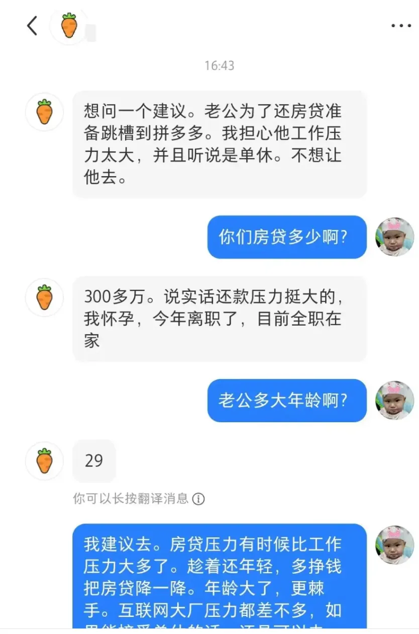 刷到一位网友的倾诉,她29岁的老公,正被300多万的房贷压得喘不过气,最近打算从当前公司跳槽去拼多多。