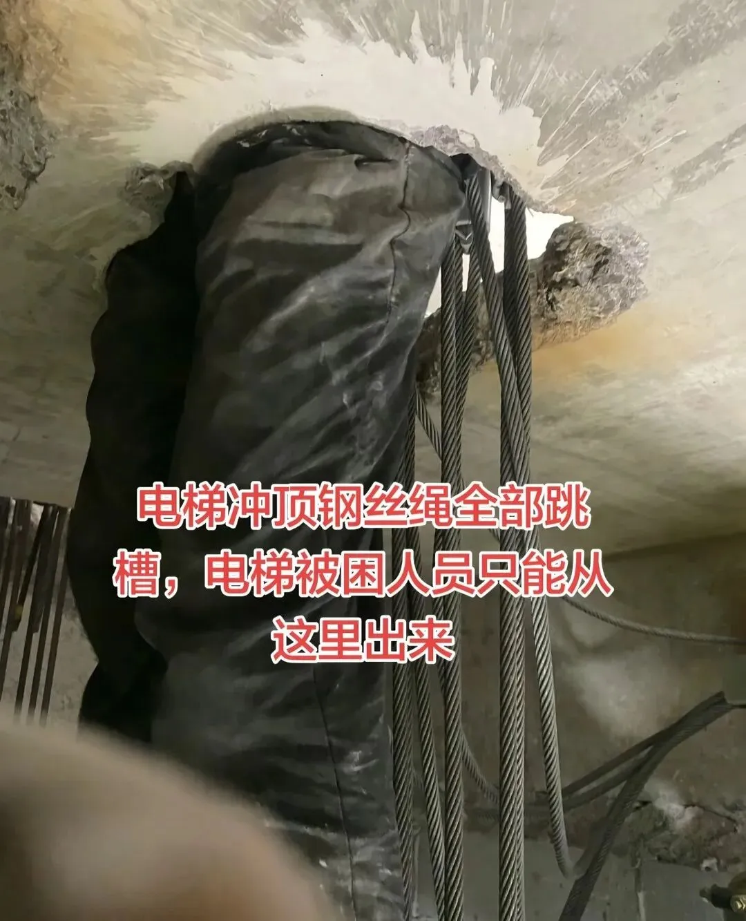 电梯冲顶钢丝绳全部跳槽,被困人员只能从这里出来!