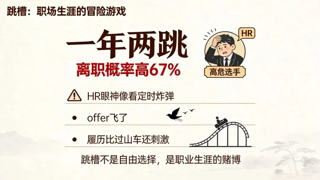 开工才三天,职场群里已经哀嚎一片了。有人跟我吐槽说,上周刚写了离职信,结果发现HR看他的眼神像看个定时炸弹,最后offer居然飞了。这年头跳槽哪是什么自由选择啊,根本就是拿职业生涯在玩俄罗斯轮盘赌。数据显示,一年两跳的人,下次离职概率比常人高百分之六十七,HR直接把你标成高危选手。