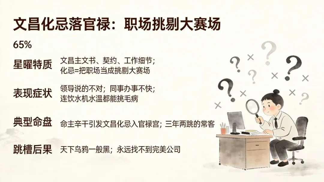 先说说最扎心的第一类,文昌化忌落在官禄宫的兄弟姐妹。文昌主文书、契约、工作细节,一旦化忌,那就是把职场当成挑剔大赛场。领导说的不对,同事办事不快,连公司饮水机的水温你都能挑出毛病。这哪里是工作啊,简直就是每天给自己找不痛快。你看命主辛干引发文昌化忌入官禄宫,这种配置的人往往三年两跳,总觉得下一个公司更好,结果跳来跳去发现天下乌鸦一般黑。你这不是跳槽,是在玩职场版的跳一跳,关键是还跳不过去。