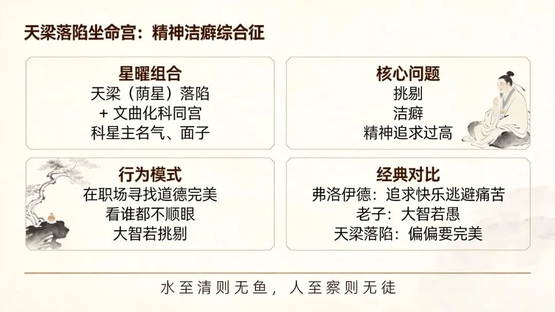 再看天梁落陷坐命宫的情况。天梁是荫星,落陷主挑剔、洁癖、精神追求过高。加上文曲化科同宫,科星主名气、面子,这就形成了一个精神洁癖综合征。弗洛伊德说过,人的本能是追求快乐逃避痛苦,但天梁落陷的人偏偏要在职场里寻找道德完美。老子讲"大智若愚",可你偏偏要大智若挑剔,看谁都不顺眼,不跑才怪。