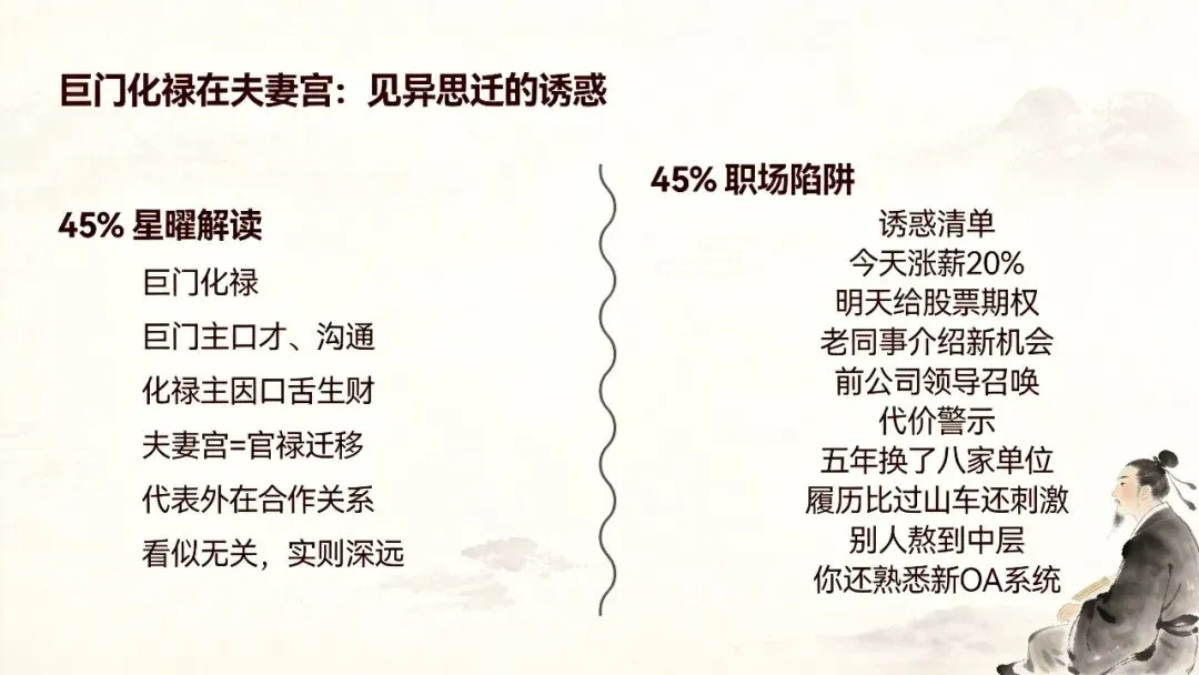 还有巨门化禄在夫妻宫的配置,看似跟工作无关,实则影响深远。巨门主口才、沟通,化禄主因口舌生财,但夫妻宫也是官禄的迁移,代表外在的合作关系。这种人最容易"见异思迁",今天这家涨薪百分之二十,明天那家给股票期权,机会是好机会啊,但是你这么折腾下来,五年换了八家单位,履历比过山车还刺激。到头来发现,那些留下来的人已经熬到中层了,你还在从零开始熟悉新公司的OA系统。
