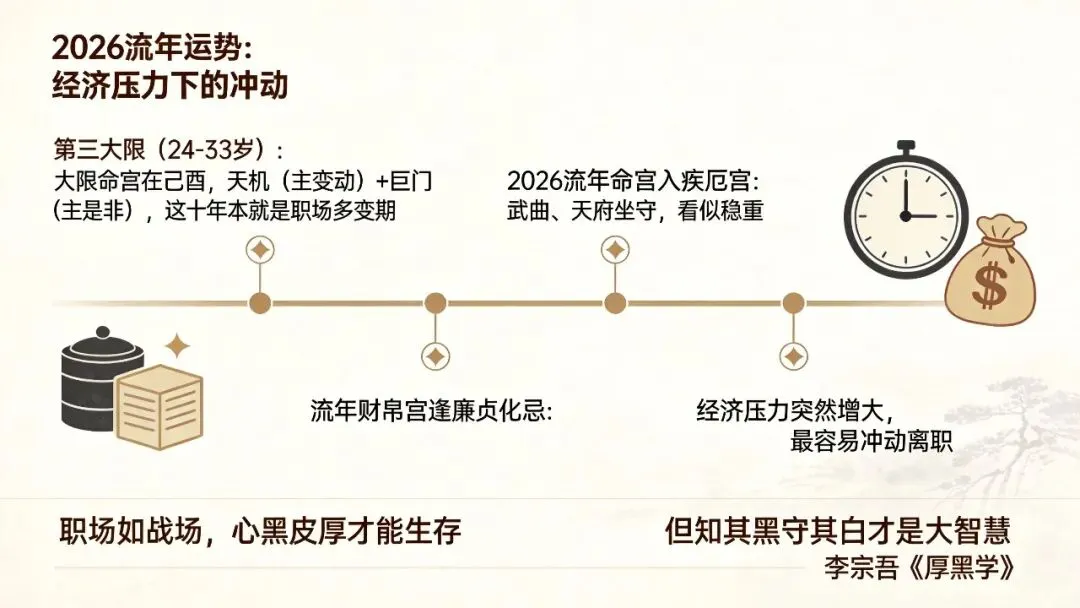 当前命主正值第三大限(24-33岁),大限命宫在己酉,天机、巨门坐守。天机主变动,巨门主是非,这十年本就是职场多变的时期。2026年流年命宫入疾厄宫,武曲、天府坐守,看似稳重,但流年财帛宫逢廉贞化忌,经济压力突然增大,这时候最容易冲动离职。李宗吾在《厚黑学》里讲,"职场如战场,心黑皮厚才能生存",但我说,知其黑守其白才是大智慧。