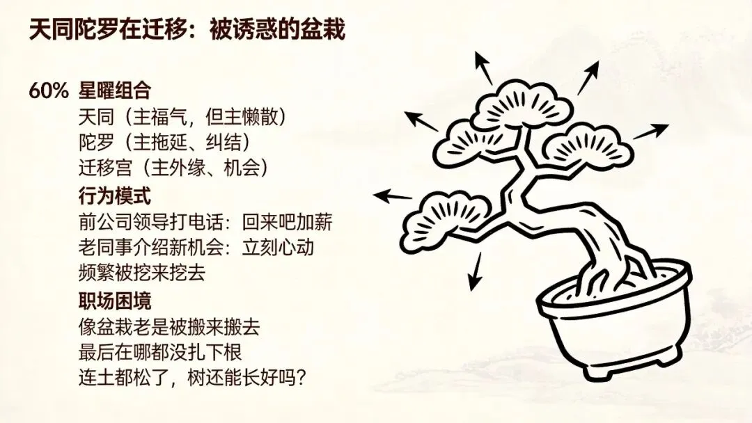 最要命的是那些天同、陀罗在迁移宫的人。迁移宫主外缘、机会,天同主福气但也主懒散,陀罗主拖延、纠结。这类人特别容易被外面的机会诱惑,前公司领导一打电话说"回来吧给你加薪",或者老同事介绍新机会,你就心动了。但你想过没有,频繁被挖来挖去,最后在哪都没扎下根。就像盆栽,老是被搬来搬去,最后连土都松了,树还能长好吗?