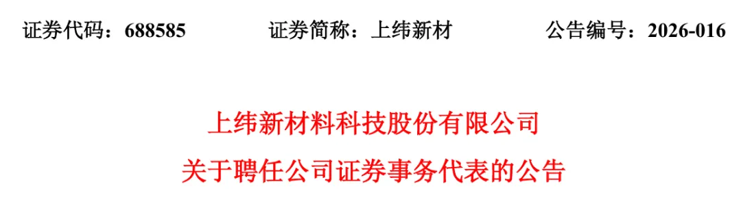 2026年3月27日,上纬新材召开第四届董事会第四次会议,同意聘任吕潇楠(简历附后) 为公司证券事务代表。吕潇楠: 1989 年出生, 金融学硕士。2015 年 1 月至 2026 年 1 月任职于华泰联合证券有限责任公司, 从事投资银行业务。