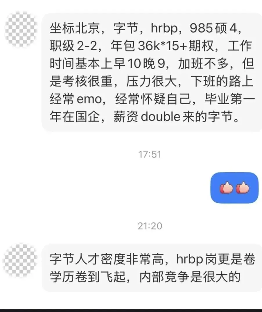 今天刷到一个字节的HRbp的投稿,实在是真实的有点残酷。他说自己是从国企跳槽到字节的,字节薪资直接给到double,可以说涨薪100%了,月36k+15薪,再加上期权,一年少说也有60-70W左右,可以说是相当牛的大佬了。毕竟是硕4,而且还是职能岗,这薪资除了在字节,其他公司估计很难给到。一方面是公司是绝对顶流,一方面是个人能力超牛,这才能达成。但是他却说,感觉考核非常重,压力也太大了,以至于经常怀疑自己,甚至在下班路上还会因为工作压力经常emo。整个人的情绪非常差,这和高薪形成了强烈的反差。只能说能拿到,说明他真的强。会emo,说明他真的痛。俗话说,钱能治愈万难,但是为什么在年薪总包60W的情况下还会出现这样的情况呢。我觉得,主要是因为前后两段职业生涯的差距太大了。国企代表什么,代表准时下班,代表节奏平缓,代表压力可控,也代表安全感较强。而字节呢,几乎全都是反着来的,节奏快,压力高,随时可能被替换,就算别人喊你停下来休息会儿,你的KPI、OKR会让你休息吗?业界一直有一个比较夸张的说法:字节和心脏...你懂得。最主要的问题是不确定性带来的安全感,业务调整、组织架构调整,+1+2领导人员调整,AI化推进等等。更重要的是,高薪背后,是个人生活的长期缺失,边界的消亡。说这些本意并不是想引发焦虑,而是想说,要学会找到适合自己的工作。如果目标就是高薪,就要提前做好心理准备,应对快节奏高压力的职场生活,如果求稳,那就留在你觉得比较合适的公司。要不然会让人觉得在show薪资。总而言之,要想获得平衡的生活状态,不仅要有面对高压的勇气,也要具备给自己托底的本事。往期精彩