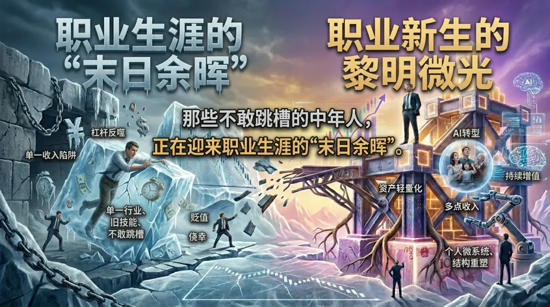 心理的提前苍老: 因为害怕失去,所以拒绝学习新工具(如AI)。当你开始说“我都这把岁数了,学这些干嘛”时,清算的丧钟已经敲响。