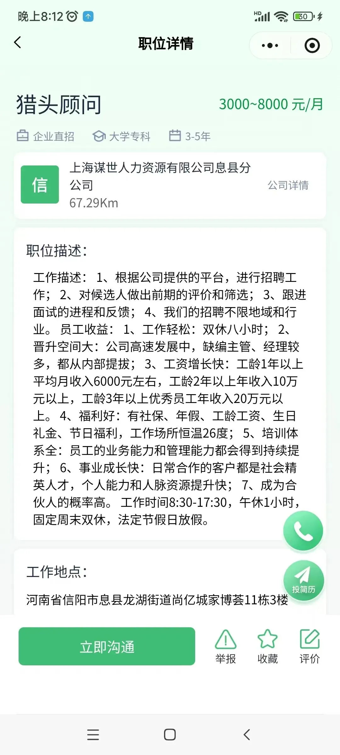息县XX公司招聘猎头顾问,3000-8000元 。