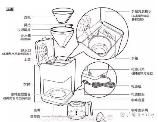 为了更直观理解滴漏咖啡机的构造,我找了内部结构拆解图,再结合 AI 整理的部件功能说明,更容易看懂它的设计逻辑。(图片来自网络,有点模糊,凑合着也能看)