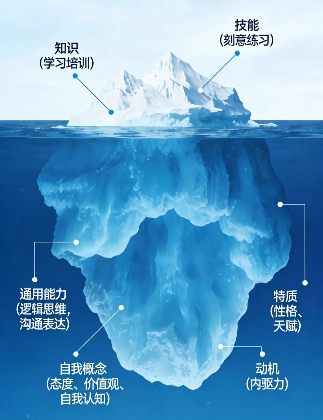 软性能力——冰山以下的通用能力,比如学习能力、沟通能力、抗压能力,思维能力等。这些是简历上看不见的能力。