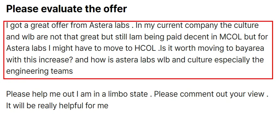 一位英特尔在职员工发帖求助,提问:是否要为了更高的薪资跳槽至湾区的公司?绝大多数网友表示,没有必要为了十几万美元的TC差价前往生活成本及房价高的地方。此外,有网友透露,Astera的工作环境非常糟糕,工作量很大……Blind统计显示,Astera WLB评分只有3.9分。为了帮大家打破找工&面试瓶颈,我们特别建立了一个北美码农求职互助群👇