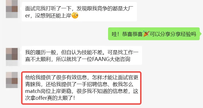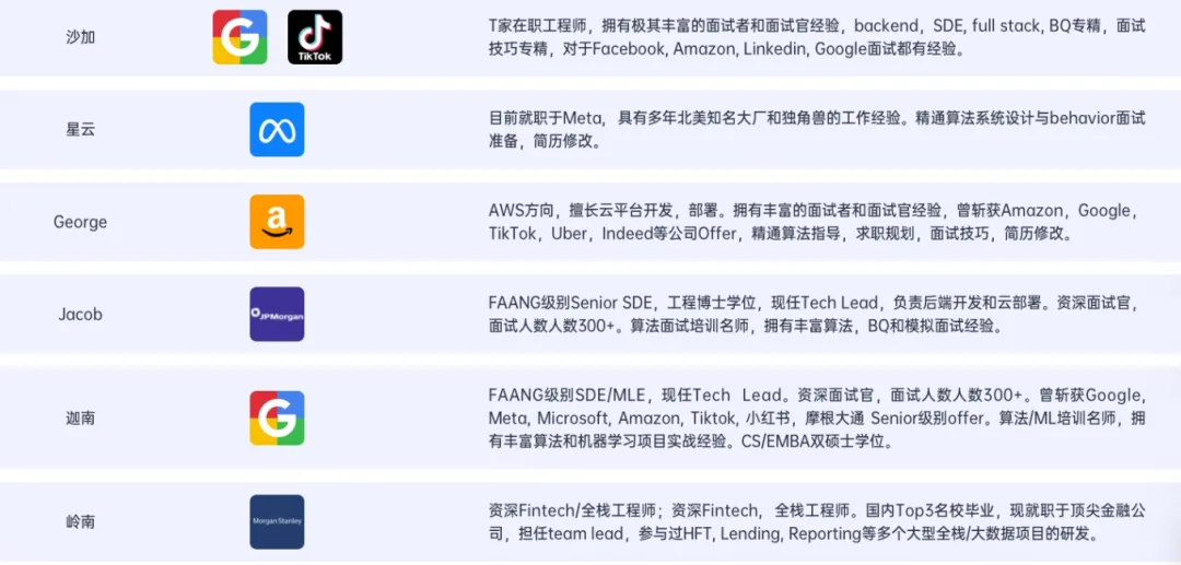 《找工咨询1v1&上岸方案定制》聚集了SDE/MLE/Fintech等各个领域的FAANG L5+大佬,拥有资深面试官经验,个个都是摸透“大厂爬梯子”玩法的老鸟👇