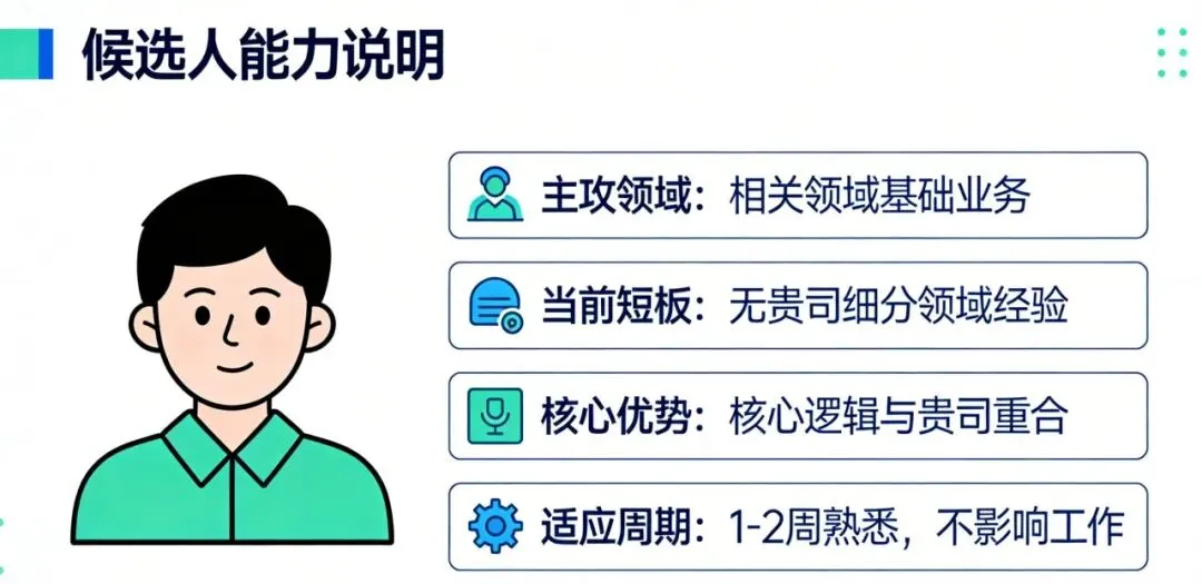 示例:候选人主攻相关领域基础业务,无贵司涉及的细分领域经验;但两者核心逻辑重合,可1-2周熟悉,不影响工作。