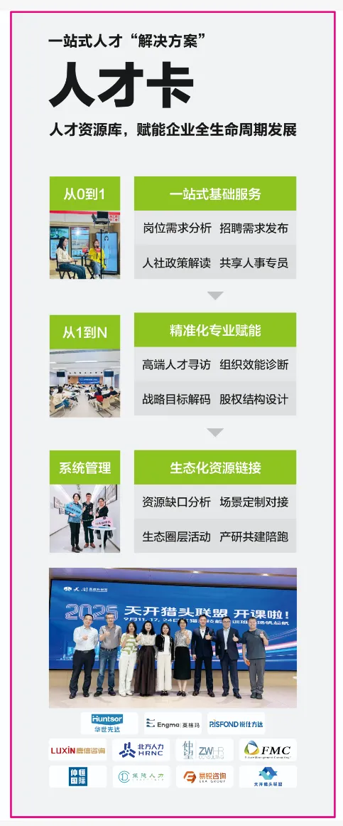 其中,重磅推出 “人才卡” ,依托强大的人才资源库与专业服务矩阵,为企业提供覆盖全生命周期的一站式人才“解决方案”。