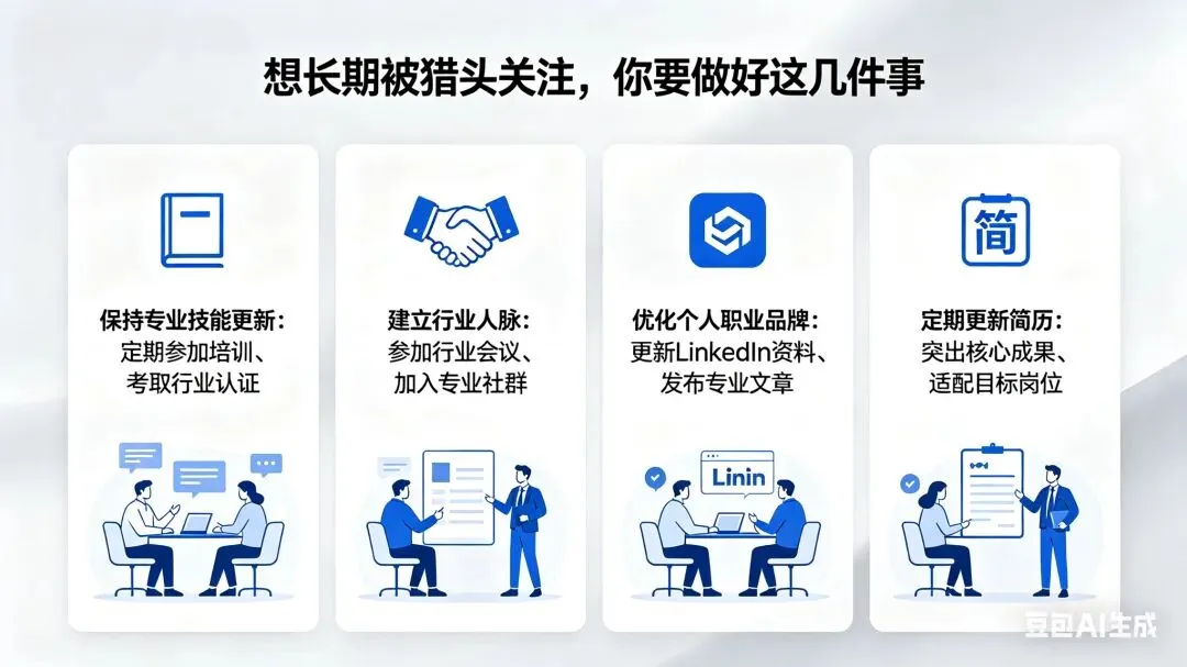 另外,定期更新职场平台简历,比如 LinkedIn、猎聘等专业求职平台,精准添加行业关键词,比如 “跨境电商运营专家”“智能制造供应链管理”,让猎头搜索时能快速匹配到你,相当于给自己打造一个 24 小时在线的职场名片。