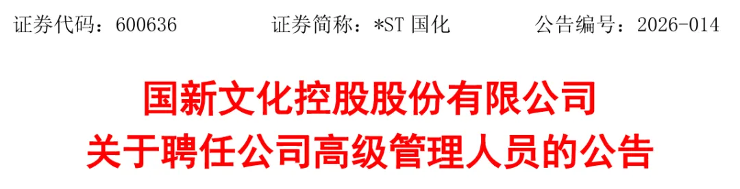 2026年4月1日,*ST 国化召开第十一届董事会第十次会议,同意聘任吴迪(简历附后) 为公司总经理。吴迪, 男, 1984 年 5 月出生, 博士研究生,2011 年 7 月参加工作。 曾任中国科学院大学管理学院博士后、 讲师,中国长城资产管理公司战略发展部业务主管, 中国国际金融股份有限公司投资银行部副总经理, 中国融通文化教育集团有限公司创新实验室执行主任。
