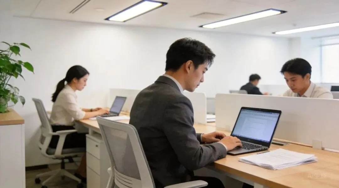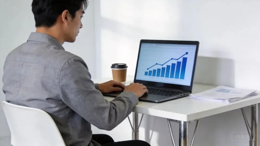 **配图1:职场人在电脑前研究行业报告,屏幕上有上升趋势图,商务办公场景,简洁干练**\n