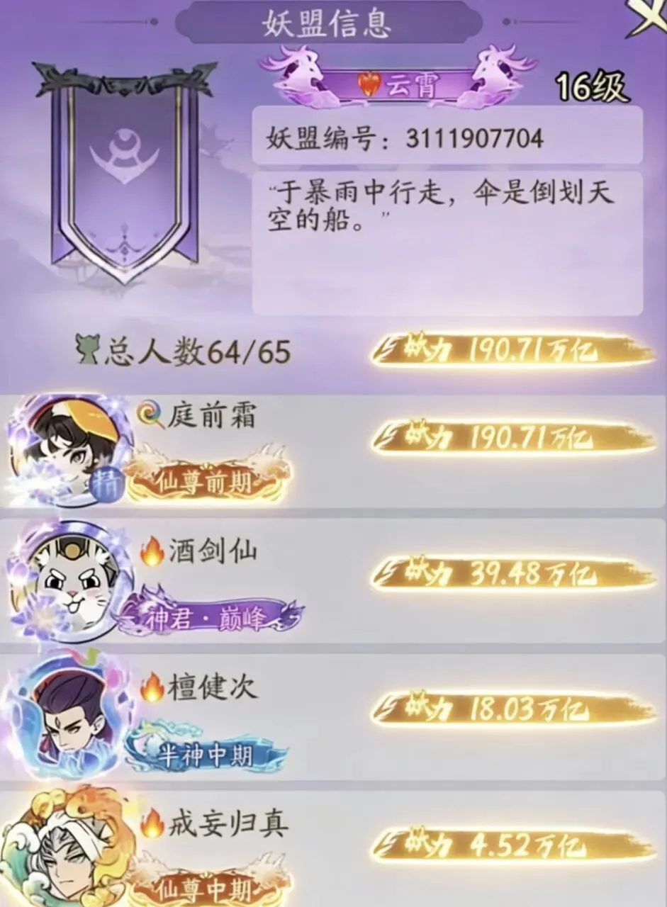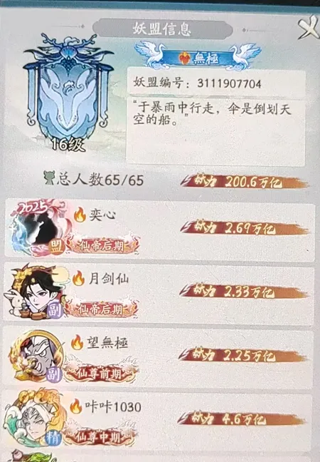 而酒剑仙退盟后转头就加入了無極,也致使無極全网第二个突破2百万亿的妖盟。原琼华解散后,原班精英真正扎堆的地方。虽然琼华当初为什么一夜散伙,到现在都没个官方说法,但無極这波确实完成了实打实的“合体补强”。两大顶级妖盟的玩家凑到一起,氪度、车身强度全线拉满,成了全服唯一能跟流年掰掰手腕的妖盟。