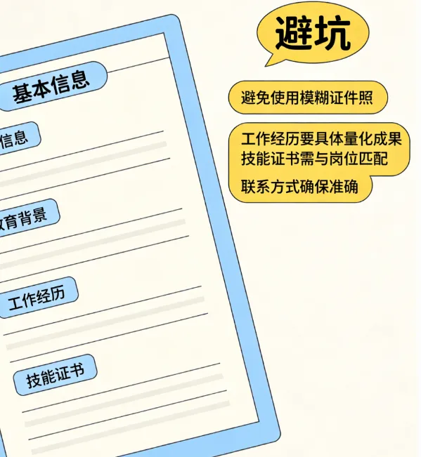简历的核心不是“写满”,而是“精准”——不踩坑,就是赢在起跑线。简历是求职第一张名片,4个高频坑一定要避开(完整指南进群领):- 别一份简历投遍所有岗位:针对目标岗位修改重点,贴合JD关键词,避免泛泛而谈。
