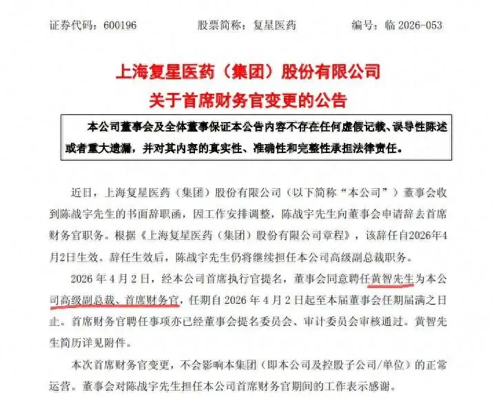 4月2日,复星医药发布公告称,因工作安排调整,陈战宇向董事会申请辞去首席财务官职务,该辞任自2026年4月2日生效。辞任生效后,陈战宇仍将继续担任公司高级副总裁职务。
