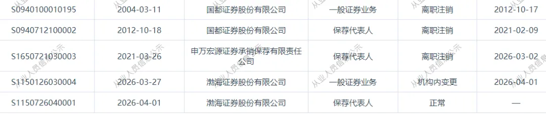 近日,证券从业系统显示,花宇,3月2日从申万宏源离任,3月27日跳槽渤海证券,4月1日变更为保荐代表人。