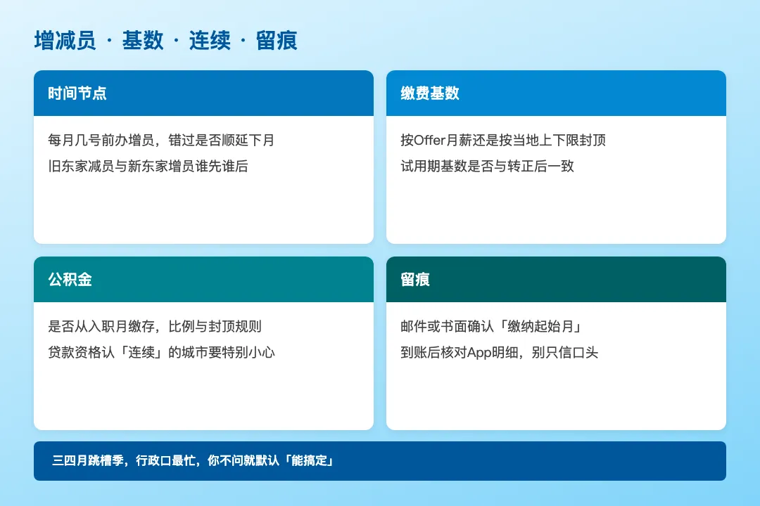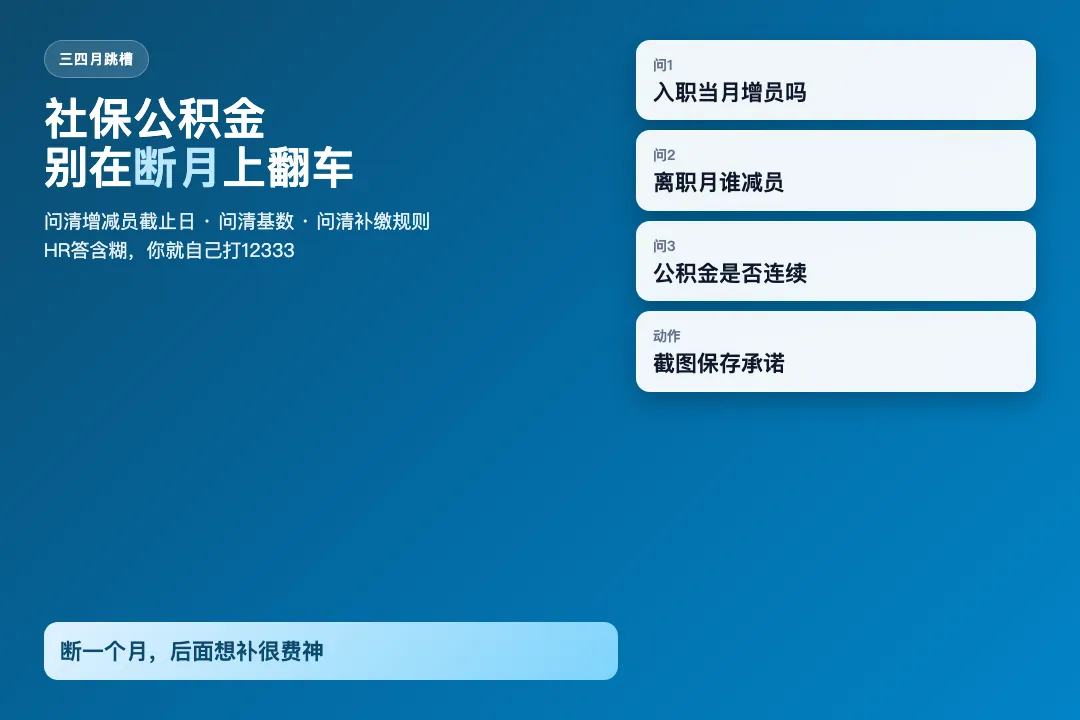 如果你从体制内或事业单位往外跳,档案与社保转移路径更复杂,本文不展开;只提醒一句:把「何时停缴、何时续上」画在时间轴上,比口头承诺「我们会衔接好」可靠。