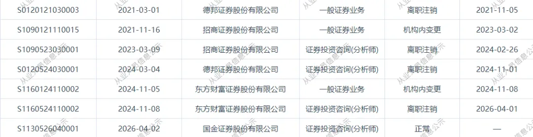毕先磊,4月1日从东方财富证券离任,4月2日加入国金证券。