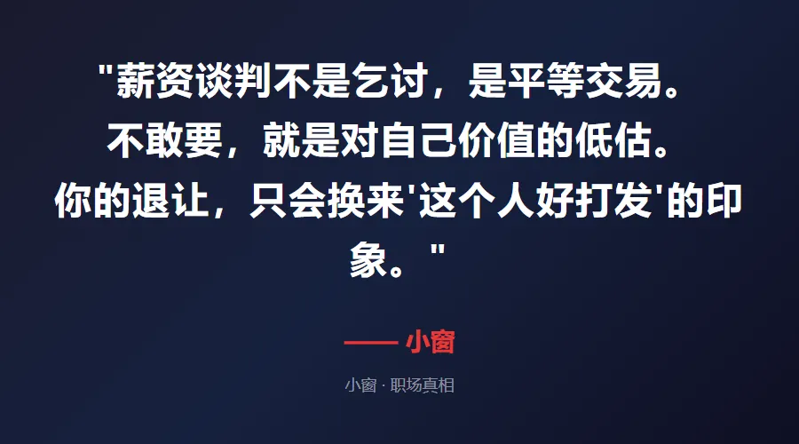 小窗的话:我见过太多人,能力不差,就是不敢开口。最后拿着低于市场价的薪资,干着比别人多的活,心里还委屈。跳槽是职场人少有的"重新定价"机会,错过了这次,下次可能是一年后。别因为不好意思,让自己每年少拿几万块。你的退让,不会换来感激,只会换来"这个人好打发"的印象。