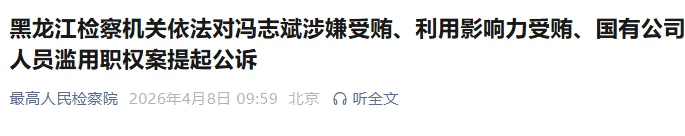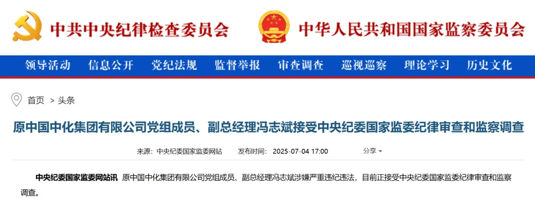 2025年7月4日,中央纪委国家监委官网通报:原中国中化集团有限公司党组成员、副总经理冯志斌涉嫌严重违纪违法,目前正接受中央纪委国家监委纪律审查和监察调查。