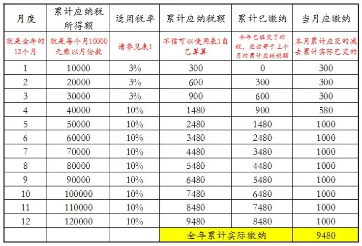 用全年的应纳税所得额乘以适用税率减去速算扣除数(具体可参考表1),12万的应纳税所得额全年汇缴应缴纳为9480元,与每月的已交税款累计数相同,因此不用补退税。
