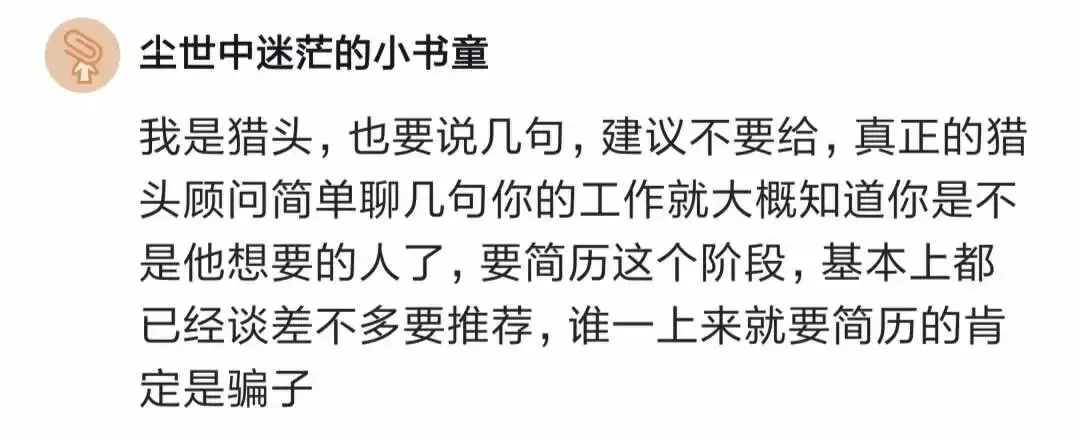 一位猎头说,建议不要给猎头简历,真正的猎头简单聊几句就知道你是不是他想要的人。要简历时基本都是谈得差不多准备推荐了,一上来就要简历的肯定是骗子。