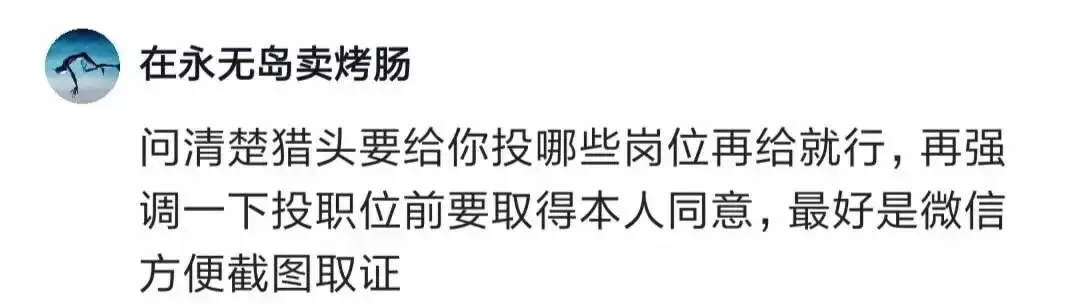 有人说,可以问清楚猎头要投哪些岗位,如果岗位合适可以给简历,再强调一下投递前要取得本人同意,最好是微信交流,方便截图取证。