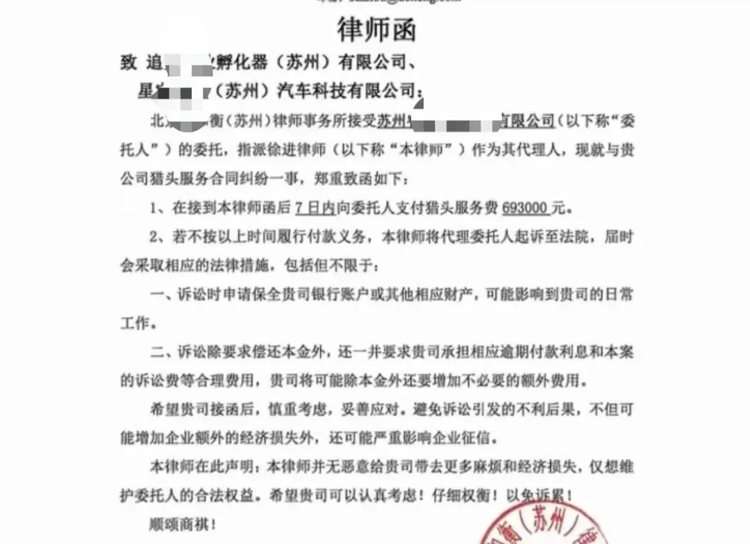 近日,二蛋在猎头群里看到,有家同行起诉了苏州某造车新势力。根据律师函内容,意思就是猎头公司和这家新势力关于猎头服务合同纠纷的事,涉及693000元,这笔费用可不低啊。