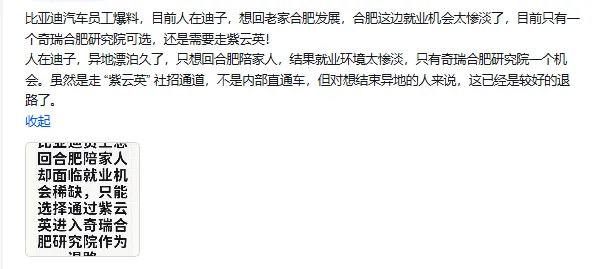 比亚迪汽车员工跳槽,奇瑞合肥研究院,原因是离家近,但是合同签内包公司:紫云英,所以比较尴尬!