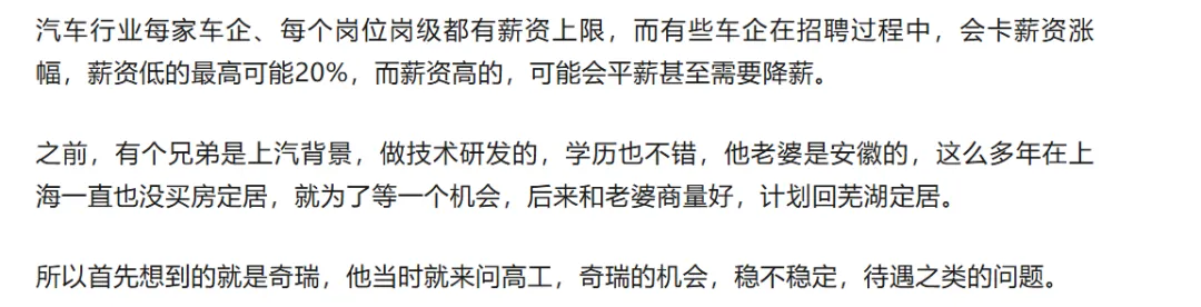 我刚从奇瑞走,之前入职奇瑞的时候明确工资涨幅最多10%,现在难道已经15%了吗现在汽车行业,42岁以后,跳槽行情怎么样?薪资基数55-60w这样奇瑞呆了一年 受不了了 选择了降薪离开了奇瑞 离开了汽车行业,虽然薪资降了一点 但是外企是真的香 厂里面工人4点半就下班了 更别提加班了。主要客户都是国外 周期都很充足 也没频繁的需求变更 赚的还是刀乐 所以舒服的有点无聊了。虽然薪资降了一些 但不后悔