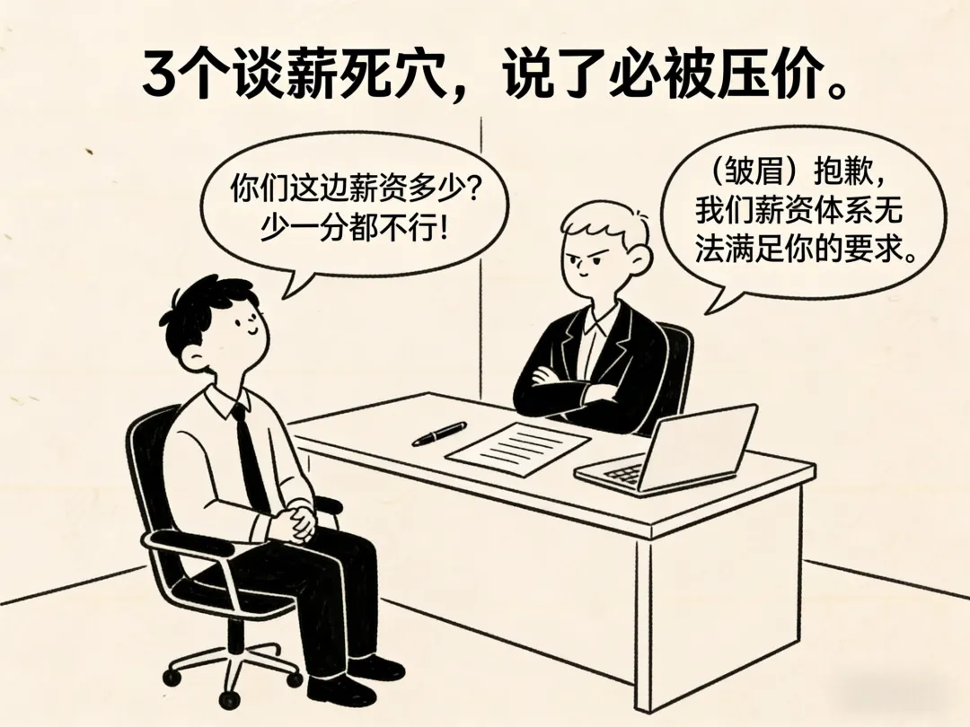 在说话术之前,先跟大家避坑,这3种话绝对不能说,说了必踩雷、必被压价,甚至丢offer:- 上来就问“你们这边薪资多少”——把主动权完全交给HR,他报一个低价,你再想往上谈就很难了,相当于自己把身价拉低;