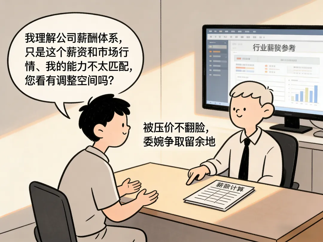 为什么好用:谈薪不是“乞讨”,是价值交换。你把具体成绩摆出来,HR就明白你不是漫天要价,而是真的值这个价——你能给公司创造价值,公司给你涨20%薪资,完全合理,也更容易被接受。第三句:被压价时,不翻脸、不妥协(救场关键句)