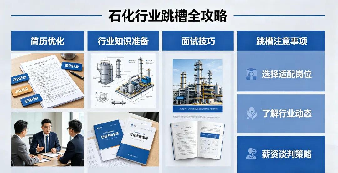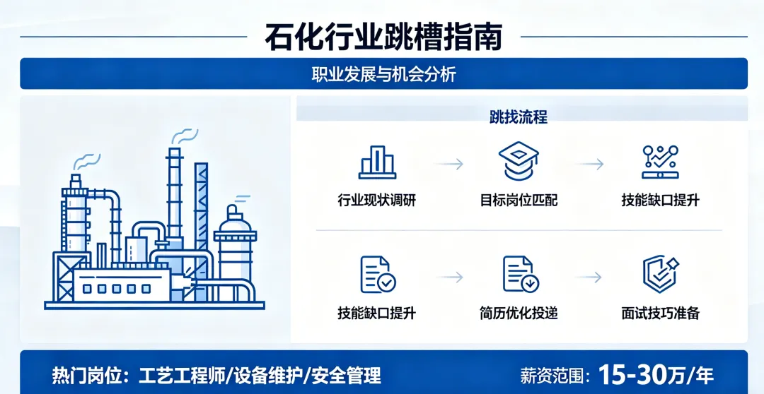 8.单纯 “钱少” 但所在企业已布局低碳项目(2026 年降薪触底,2027 年薪资将随转型盈利反弹)9.因 “累”“没意思” 想逃(职业倦怠未解决核心问题,2026 年求职竞争加剧)10.裸辞后盲目求职(2026 年石化行业求职周期平均 7.2 个月,传统岗位竞争比达 15:1)11.【2026 专属】放弃央企正式岗,盲目跨界至非能源领域(石化经验迁移性弱,失败率超 60%,2026 年跨界转型成功率仅 28%)反例 1:某石化设计院工程师老李,年薪 35 万裸辞想转型互联网,因缺乏数字化技能,空窗 10 个月后仅拿到 28 万的传统化工岗位 offer,错失 2026 年央企新能源业务扩招机遇。反例 2:32 岁的石化销售王敏,因传统油品销售提成低,盲目跳槽到新能源汽车公司做电池销售,未意识到 2026 年碳成本显性化后,石化绿色产品销售需求激增,重返行业时薪资缩水 30%,且错失碳配额交易相关销售岗位的高薪机会。四、2026 跳槽必看 5 大考虑点(石化行业定制版)