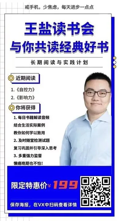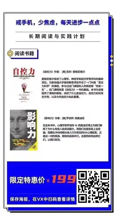 相信无论你想提升哪方面,都可以在本期读书会找到正确的掌控自己、影响他人的方法,拿回人生的主导权、提升社交的影响力。1、我对《自控力》和《影响力》这两本书籍的解读音频(23节)、文稿(超5W字),除了讲解书中内容外,会教你如何在生活中学以致用。2、每节内容会布置作业、思考题。3、会有专门的同学督促大家读书、完成作业。