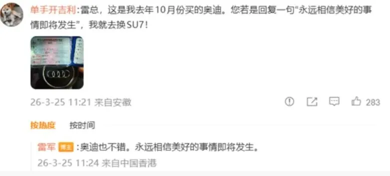 3月25日,一位ID显示为安徽的奥迪车主,在雷军的微博底下留了一句:“雷总,您要是回复一句‘永远相信美好的事情即将发生’,我立马换SU7。”
