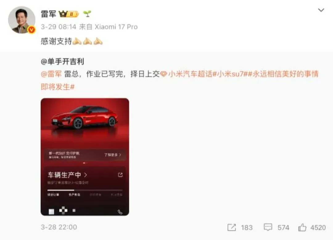 事情到这,很多人以为就是个常规互动,过去了就过去了。但三天后,这位车主真的晒出了SU7的订单截图——赤霞红外观,19寸钻石轮毂,配文:“作业已写完,择日上交。”