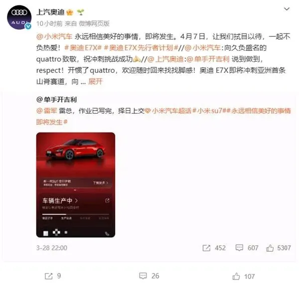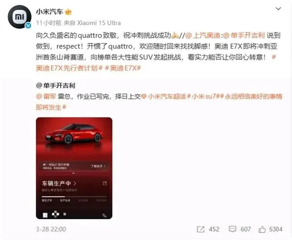 小米官方的回应堪称教科书:“向久负盛名的quattro致敬,祝冲刺挑战成功。”没有攻击,没有贬低,对标杆技术的敬意给足,姿态也摆正了。既没有因为车主“投奔”而踩奥迪一脚,也没有因为自己销量好而目中无人。