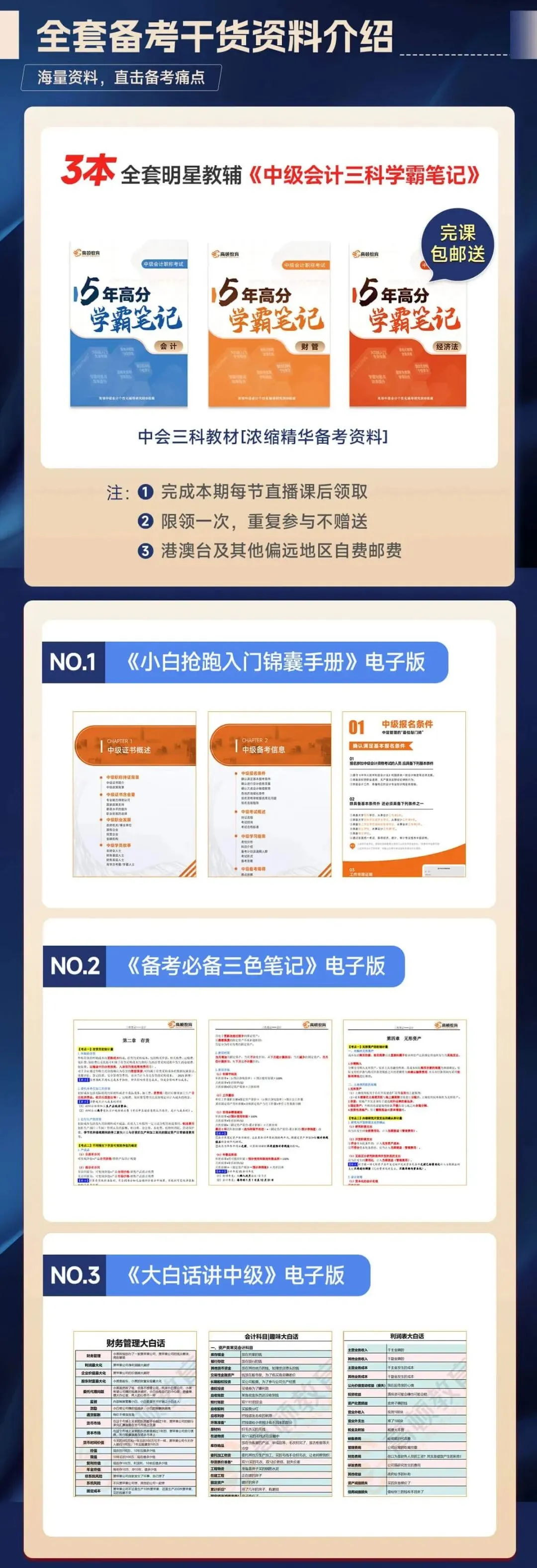 无套路!三科海量资料全送。3本全套明星教辅《中级会计三科学霸笔记》、小白抢跑入门手册、精粹思维导图、学霸三色笔记等等。